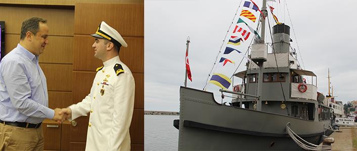 TCG Nusret Komutanı Kandaş, gemi ve ziyaretleri hakkında Giresun Belediye Başkanı Kerim Aksu’ya bilgi verdi.