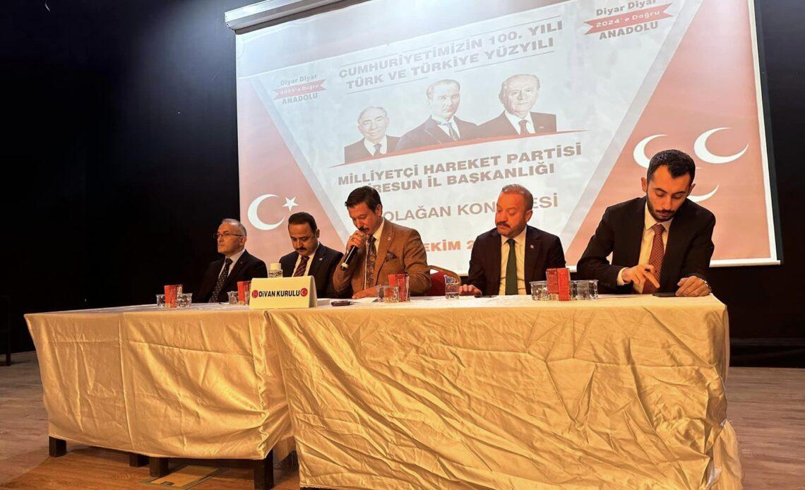 Milliyetçi Hareket Partisi’nin 14. Olağan Giresun İl Kongresi Giresun Belediyesi Kültür ve Fuar Merkezi’nde gerçekleştirildi. Yeni il başkanı ve yönetim kurulunun belirlendiği kongrede seçime tek aday olarak katılan Abdullah Karaosmanoğlu, partisinin yeni Giresun İl Başkanı oldu.