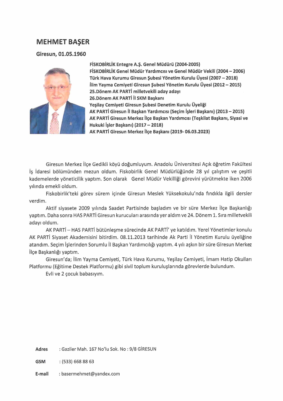 Yapılacak olan Türkiye Büyük Millet Meclisi 28.Dönem Milletvekilliği seçimlerinde aday adayı olabilmek için 4 yılı aşkın bir süredir yürütmekte olduğum AK Parti Giresun Merkez İlçe Başkanlığı görevinden 06.03.2023 Pazartesi günü itibariyle ayrılmış bulunmaktayım.