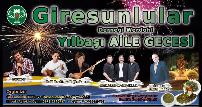 Werdohl Giresunlular Dernek Başkanı Aytekin Çetin “Bütün bir yılın yorgunluğunu atmak ve üyelerimiz ve Giresun dostları ile böylesine önemli bir gecede bir arada olmak için yılbaşı eğlence gecesi düzenledik. Yılbaşı gecesi programımızda özelikle Giresun yemekleri ve yöresel Müziklerimiz le dostlarımızın hem midelerine hemde kulaklarına hitap edeceğiz. Yılbaşı gecesi Giresun usulü Pancar Çorbası (Lahana) Pancar Sarması, Fasulye Turşusu ile yeni yıla girmek isteyenleri Werdohl’e Cici Saray’a bekliyoruz.” dedi.
