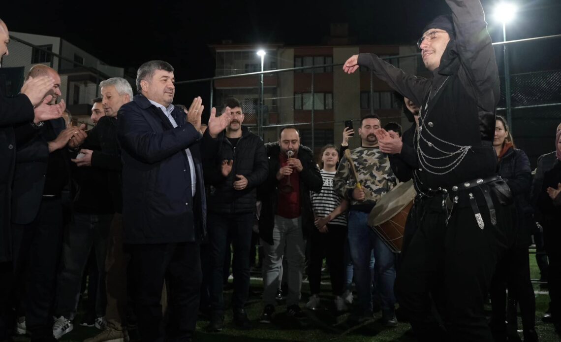 Davul zurna, meşale ve tezahüratlarla karşılanan Atekin Şenlikoğlu, toplantı alanına girişte Giresun karşılaması oynadı.