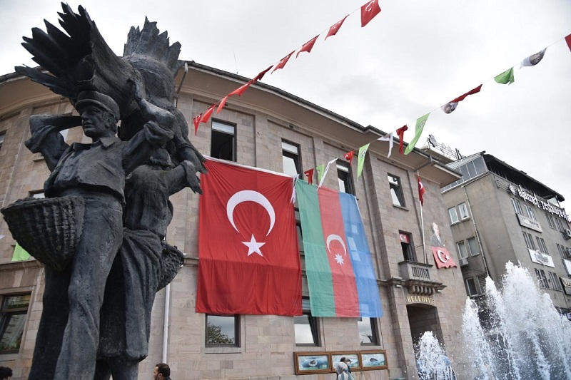 Giresun Belediyesi ana hizmet binasına Türk Bayrağı ve Azerbaycan bayrağı yan yana asılarak, kardeş Azerbaycan‘ın her zaman yanında olduğumuz mesajı verildi.