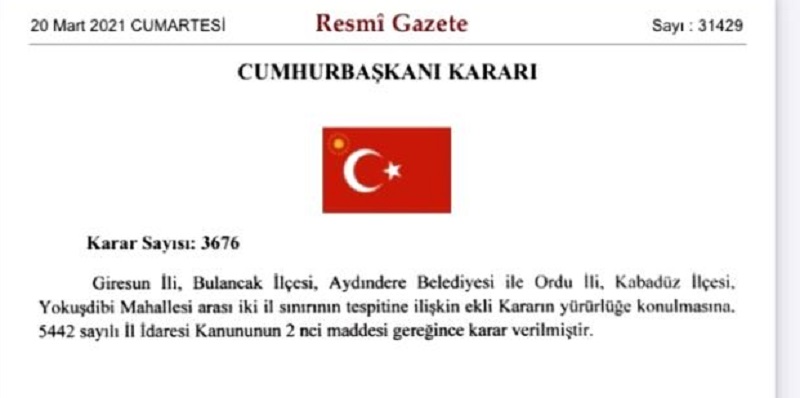 Giresun’un Bulancak ilçesi Aydındere Belediyesi ile Ordu’nun Kabadüz ilçesi Yokuşdibi Mahallesi arasındaki il sınırı yeniden belirlendi.
