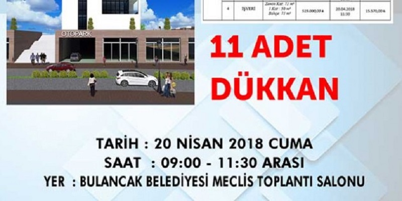 Bulancak Belediyesine ait Kapalı Pazar Yeri Binası Zemin katında bulunan 11 adet işyeri, 20 Nisan 2018 Cuma günü Belediye Meclis Salonunda yapılacak ihaleyle “Kapalı Teklif Usulü” ile satılacak.
