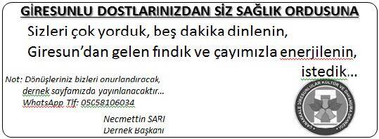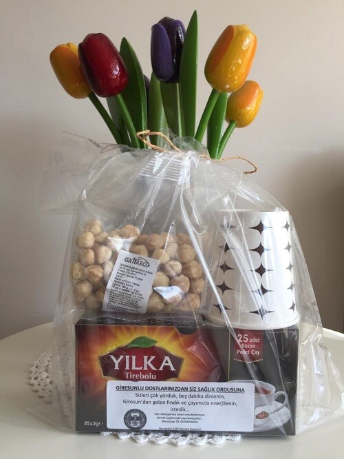 Çanakkale Giresunlular Kültür ve Dayanışma Derneği Başkanı Necmettin Sarı konu ile ilgili şunlara değindi; Sağlık ordusu neferlerinin kendilerine beş dakika olsun ayırıp, paketimizin içerisindeki Giresun çayımızı, aynı paketteki bardakları kullanarak demleyip içmelerini ve Koronavirüs ile mücadele için çayın yanında yiyecekleri fındık ile bağışıklık sistemlerini aldıkları enerji ile sağlamayı amaçladıklarını, ben ve benim gibi birçok arkadaşım, geçmişteki görevlerimiz nedeniyle daha düne kadar o cephenin asıl sahiplerindendik. O nedenle; bugün Koronarüs ile ilgili haberlerde geçen “hasta sayısı şu kadar, vefat sayısı bu kadar” ifadeleri, dinleyenlerin saniyesini alan bir haberken, bu gün cephede olan sağlık neferlerinin hastalarını tedavi ederken neler yaşadıklarını, hastalarını kaybedenlerin hangi duygular içerisinde olduklarını, bizler için saniyeler alan her bir vakanın onlarda günlük ve hatta haftalık nasıl travmalar yarattığını iyi biliriz. Tam da bu noktada, cephemizde sağlam duran sağlık ordumuzun yanında olmak, onlara yalnız olmadıklarını hissettirmek için biz Çanakkale Giresunlular Kültür ve Dayanışma Derneği olarak bir imece yapmaya karar verdik”