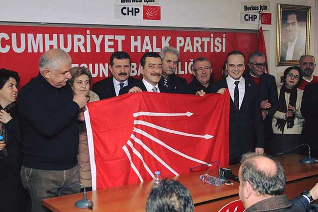 CHP eski İl Başkanı Sinan Kitapçı bayrağı yeni seçilen İl Başkanı Necati Tığlı’ya teslim etti.