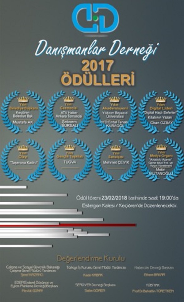 Gazetemize özel açıklama yapan Danışmanlar Derneği Genel Başkan Vekili Yücel Bakar ” İş ve Meslek Danışmanları olarak kurduğumuz Danışmanlar Derneği her geçen gün daha güzel çalışmalara imza atıyor. Derneğimiz üyeleri ve internet sitemizden yaptığımız değerlendirme ve seçici heyetimizin kararları ile 2017 yılı enlerini belirledik. Ödül alanlara ödüllerini 23 Şubat 2017 Ankara’da Estergon Kalesi (Kümbet Salonu) Keçiören’de 19.00’da teslim alacaklar.” dedi.