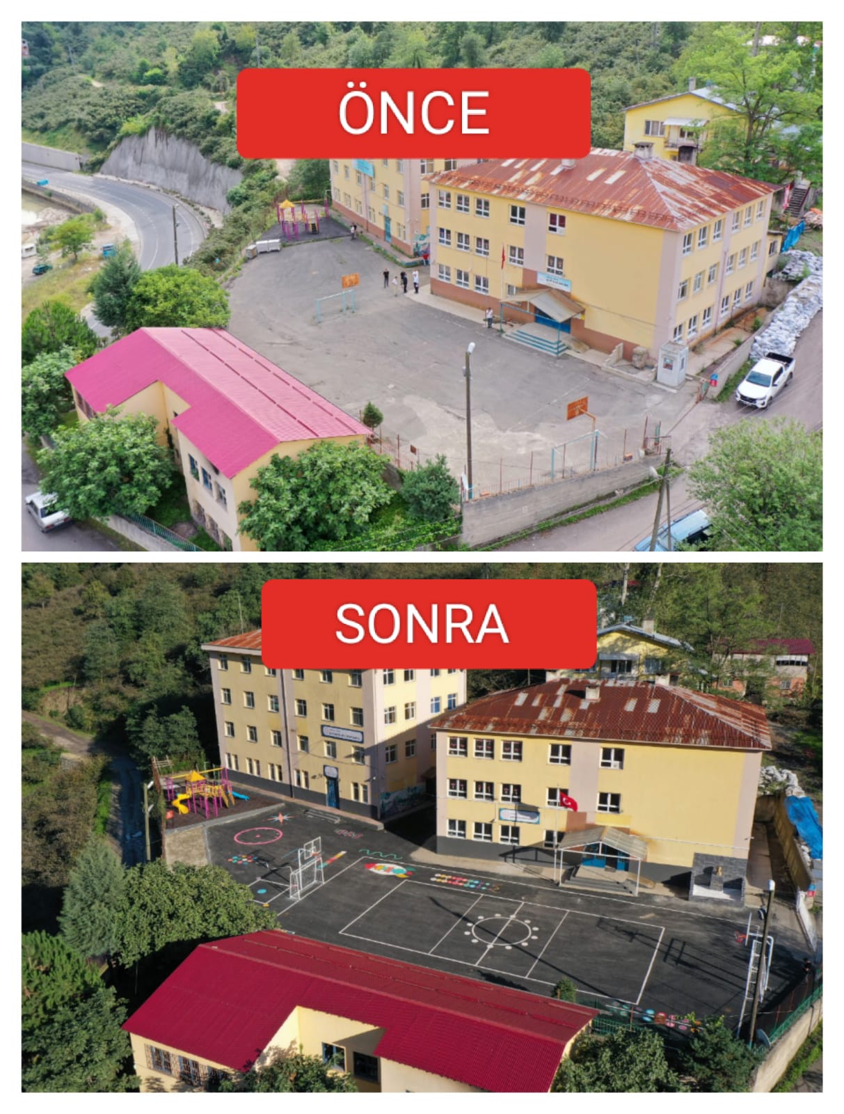 Yapılan çalışmalarla birlikte okul bahçesi baştan sona yenilenmiş, çevre düzenlemesi ve peyzaj uygulamalarıyla öğrencilerin güvenle oyun oynayabilecekleri modern alanlar oluşturulmuş oldu.