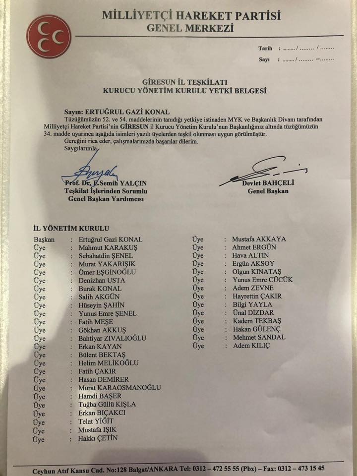 Ülkü Ocakları eski Giresun İl Başkanı Ertuğrul Gazi Konal başkanlığında oluşturulan yeni yönetim kurulu şu isimlerden oluştu.