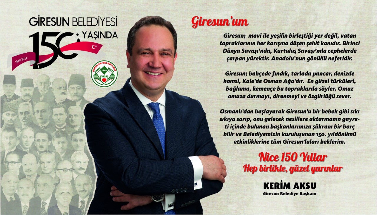 Giresun Belediye Başkanı Kerim Aksu, geçmişini bilmeyenin, geleceğini iyi planlamasının mümkün olmadığını belirterek; “Geçmişten günümüze Giresun’a hizmet etmiş başkanlara, meclis üyelerine, görev yapan personele minnet borçluyuz. Belediye başkanlığı yaşadığın şehre hizmet makamıdır. Doğup büyüdüğümüz şehrimize borcumuzu ödemeliyiz. Dedelerimizden devraldığımız bayrağı zirveye taşıyıp, eserler bırakarak gelecek nesillere devretmeliyiz. Giresun tarihi destanlarla doludur. Cumhuriyetin kurulmasında 2 gönüllü alayla vatan savunmasında rol alan dedelerin torunları olarak, bugün aynı inançla vatanımızı, bayrağımızı, Cumhuriyetimizi, özgürlüğümüzü korumaya ant içtik. Hangi mevkide olursa olsun, Giresun’a hizmet edip aramızdan ayrılanları saygıyla anıyor, yaşamını sürdürenleri saygıyla selamlıyorum. 150 yıllık Giresun tarihini etkinliklerle kutlayacağız, yapılanları hatırlayacağız” şeklinde bilgi verdi.