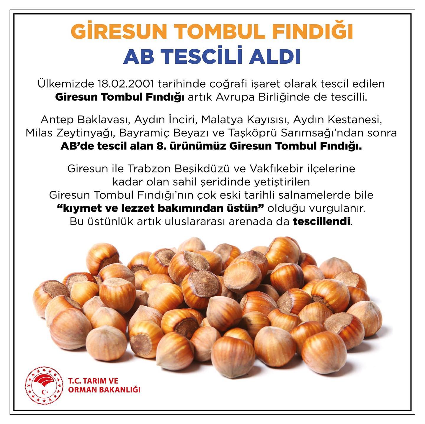 Avrupa Birliği (AB) Komisyonunda tescil edilerek ülkemizi temsil eden 8 inci ürünümüz Giresun Tombul Fındığı, aynı zamanda menşe adı ile korunan 7 inci coğrafi işaretli ürünümüz olarak Avrupa Birliği Komisyonu kayıtlarında yerini almıştır.