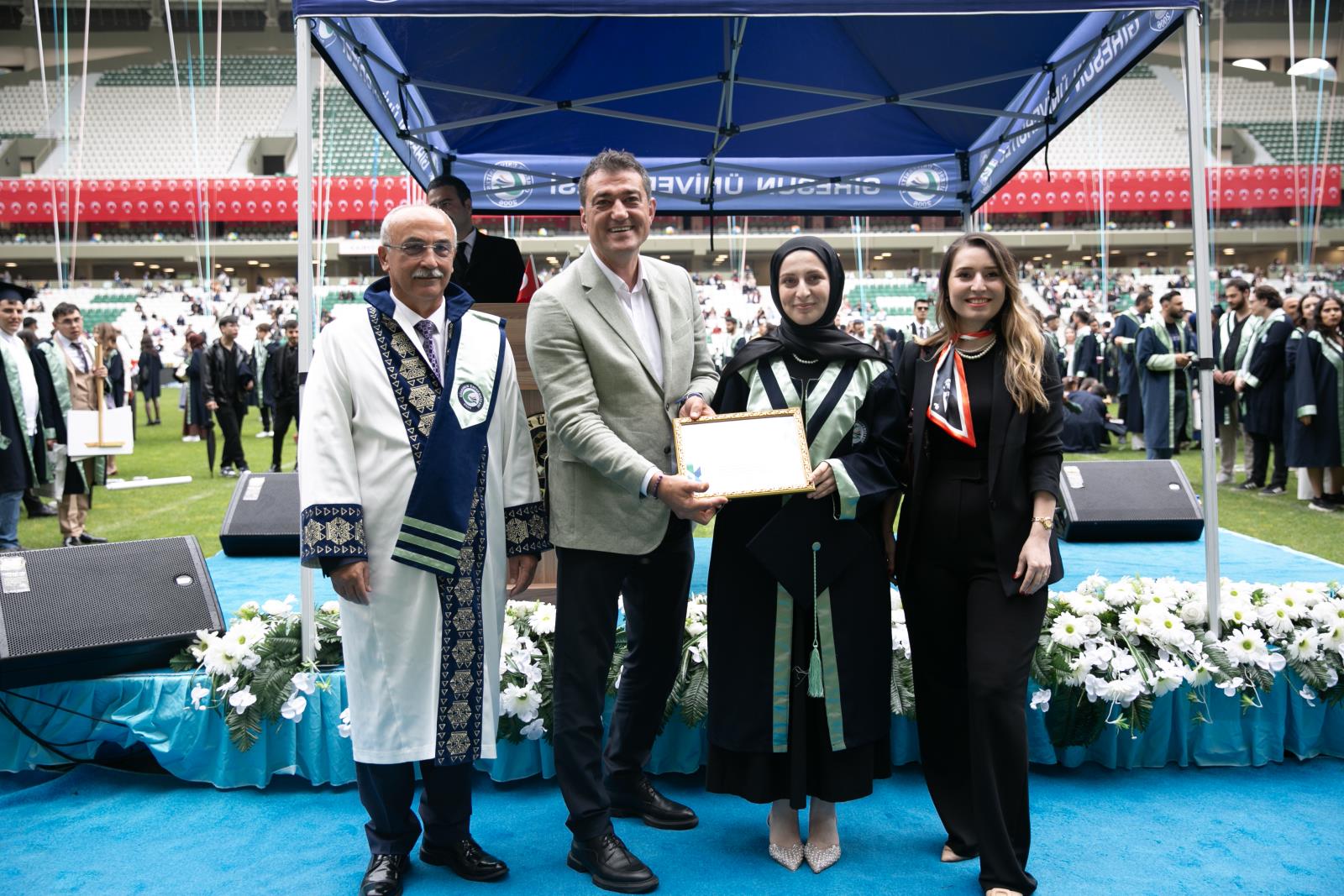 Bölüm birincilerine ödülleri verilen törende, öğrenciler kep atarak mezuniyetlerini kutladı.
