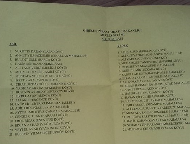 Giresun Ziraat Odasının yapılan olağan genel kurulunda seçimlere mevcut başkan Nurittin Karan başkanlığındaki tek liste ile gidildi.