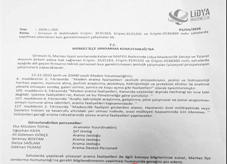 Lidya Madencilik’ten Batlama Vadisi’nde Jet Hamle: Jandarmaya Bildirim Yapıldı, Şirket, Giresun Merkez İlçe Jandarma Komutanlığı’na resmi bir yazı göndererek bölgedeki çalışmalarını başlattığını bildirdi.