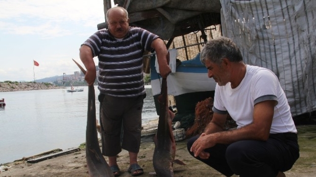 Köpek balığını yakalayan balıkçı Mehmet Kara, son günlerde kıyıya yakın yerlerde rastlanan camgöz cinsi köpek balığının balıkçı ağlarına zarar verdiğini söyledi.