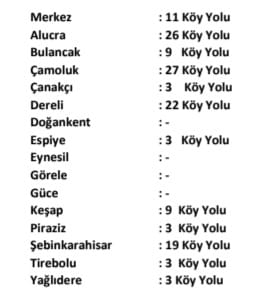 Giresun Valiliği Basın Halkla İlişkiler Müdürlüğü tarafından yapılan açıklamaya göre Giresun Merkez’de 11 köy başta olmak üzere;