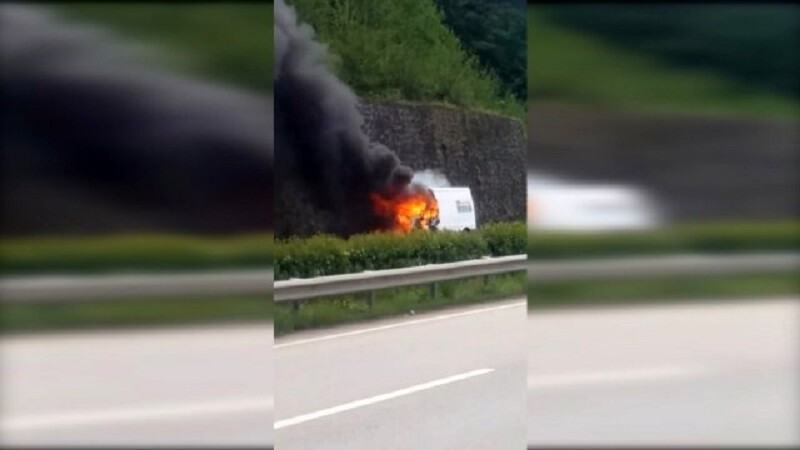 Uluburun Tüneli girişinde meydana gelen olayda alev alan araç yol kenarına çekilirken çevredeki vatandaşlar tarafından cep telefonu ile kayda alındı. Görüntülerde yol kenarına çekilmiş olan minibüsten alevler yükselirken, küçük çaplı patlamaların meydana geldi. Olay yerine itfaiye ekipleri sevk edilirken, minibüs yangında kullanılamaz hale geldi.