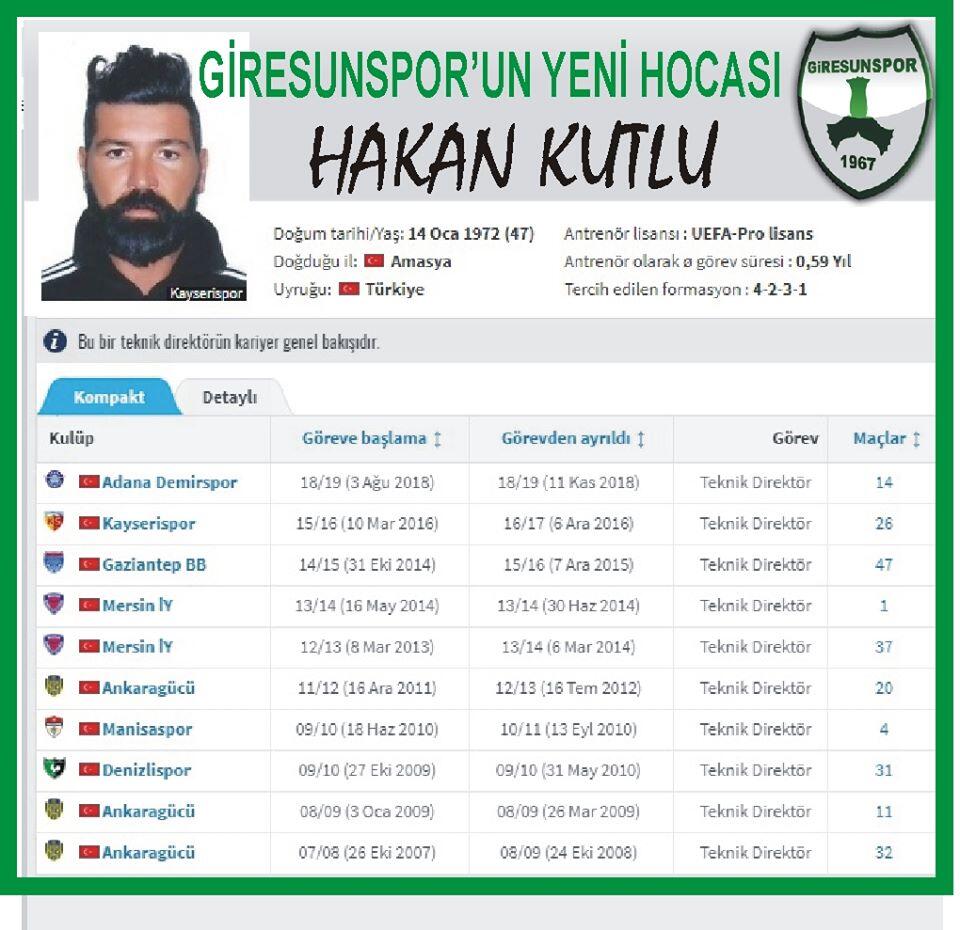 Türkiye Futbol Federasyonu (TFF) 1. Ligine kötü bir başlangıç yapan Giresunspor teknik direktör Hakan Kutlu ile anlaştı.