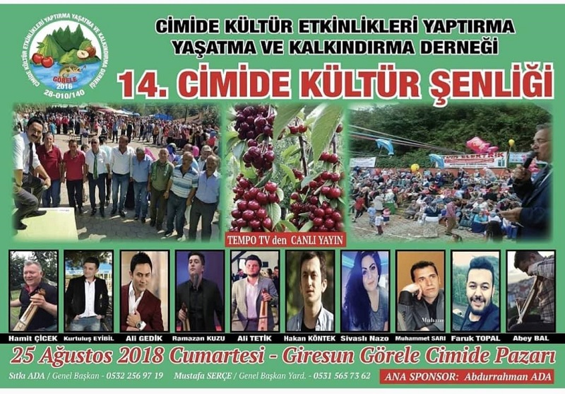 Cimide Kültür Etkinlikleri Yaptırma Yaşatma ve Kalkındırma Dernek Başkanı Sıtkı Ada ” 14 yıldır geleneksel olarak düzenlediğimiz kültür şenliğimiz bu sene dop dolu bir program ile yöremiz halkının beğenisine sunulacak Giresun’un yetiştirdiği bir birinden değerli sanatçılarımız, kemençe ve sazlar eşliğinde katılacak olan değerli misafirlerimizi eğlendirecek. Giresun ve İlçeleri ile Görele’mizin kıymetli protokolünün de davetli olduğu etkinliğimiz yöremize yakışır bir şekilde kutlanacak. Şenliğimize sponsor olan değerli sivil toplum örgütü temsilcileri ve yine yöremizin yetiştirdiği İstanbul Esenyurt Belediye Başkan Yardımcısı Abdurrahman Ada’ya teşekkürü borç biliyoruz. Şenlik düzenleme komitesi olarak bütün hemşerilerimizi bu güzel etkinliğimize bekliyoruz.” dedi.
