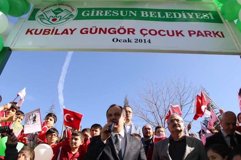 Muhtar Şahin’den sonra konuşan Giresun Belediye Başkanı Kerim Aksu da, “Muhtarımızın da dediği gibi Giresun şehir merkezi oldukça sıkışık bir yapıya sahip. Bu yüzden şehir içinde nefes alacak alanlar yaratmaya büyük özen gösteriyoruz. Göreve geldiğimiz günden itibaren şehrin mevcut park sayısını iki katına çıkardık. Ancak bu parkın hepimizin için başka bir önemi var. Kaleci Zafer’in, yani Zafer ağabeyimizin oğlunu geçtiğimiz yıllarda kaybettik. Onun adını yaşatmak adına ilk olarak Mustafa Kemal Ortaokulu’na kurulan kütüphaneye değerli kardeşimizin adını verdik, şimdi de mahallenin ilk çocuk parkına Kubilay kardeşimizin ismni verdik. Kubilay’ın ismini yaşatacağız, Kubilay Güngör Parkı mahallemize, şehrimize ve çocuklarımıza hayırlı uğurlu olsun.” Dedi.