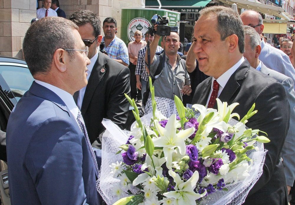 Giresun’un CHP’li Belediye Başkanı Kerim Aksu Ak Parti Giresun Milletvekili Başbakan Yardımcısı Nurettin Canikli’yi Giresun Belediyesi ziyareti kapsamında kapıda çiçekler ile karşıladı.
