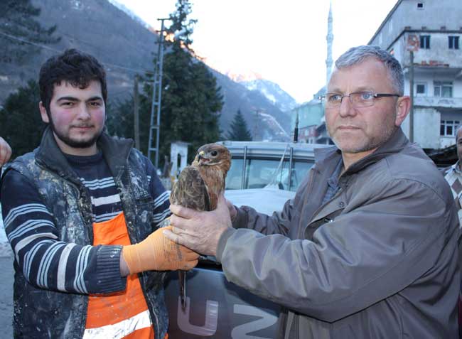 Müslim Kahraman, ” Sağ kanadı avcılar tarafından atıldığı tahmin edilen saçma ile vurularak yaralandığını tahmin ettiğimiz şahini dere kenarında bulduk. Bir yaşında olduğu tahmin edilen şahini İlçe Jandarmayı ve Giresun Orman Koruma Milli Parklar Şube Müdürlüğünü telefonla arayarak haber verdik. Gelen ekipler, son yıllarda avı yasak olduğu Kızıl Şahin’lerin göçmen bir kuş olduğunu ama her nedense bir daha göç yapmadıklarını, bu bölgede kaldıklarını söylediler. Yaralı kızıl şahini köye gelen Jandarma ve Giresun Doğa Koruma Milli Parklar ekibine teslim ederek insanlık görevimizi yerine getirdik“ dedi.