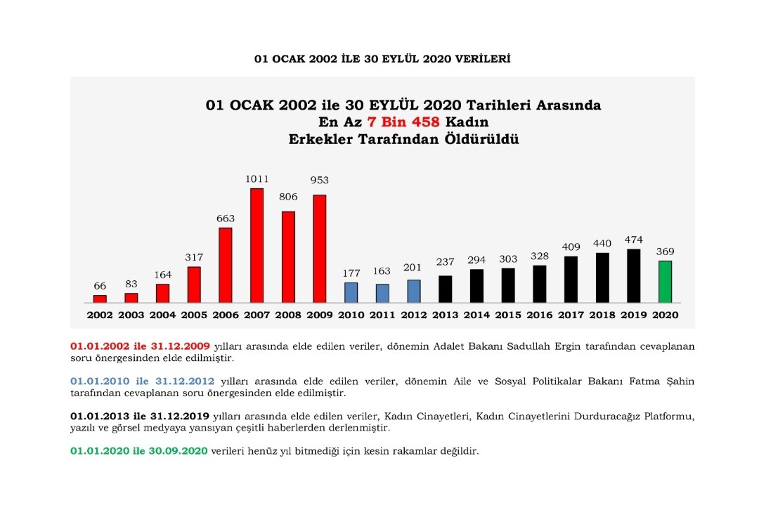 Tığlı “Türkiye’de 2003 yılında erkekler tarafından öldürülen kadın sayısı 83 iken, 2020 yılının dokuz aylık bölümünde bu sayı 369’dur ve yıl daha bitmemiştir. 17 yıldaki dehşet verici artış yüzde 344.5 civarında olmuştur.