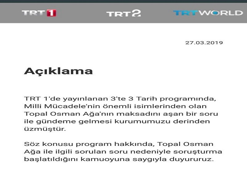 TRT’nin resmi internet sitesinden yapılan açıklamada şunlara yer verildi; “TRT 1’de yayınlanan 3’te 3 Tarih programında, Milli Mücadele’nin önemli isimlerinden olan Osman Ağa’nın maksadını aşan bir soru ile gündeme gelmesi kurumumuzu derinden üzmüştür.