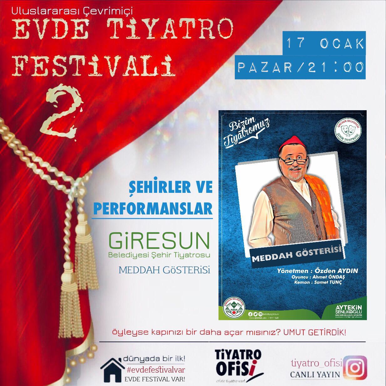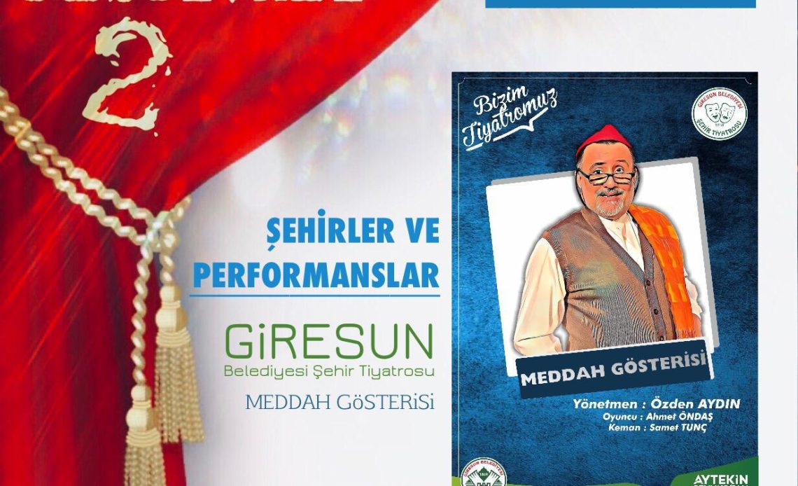 Programa göre, Giresun Belediyesi Şehir Tiyatrosu 17 Ocak Pazar günü saat 21.00’da yönetmenliğini Özden Aydın’ın yaptığı oyuncu Ahmet Öndaş ve Keman Samet Tunç’un rol aldığı meddah gösterisini online olarak sunacak.
