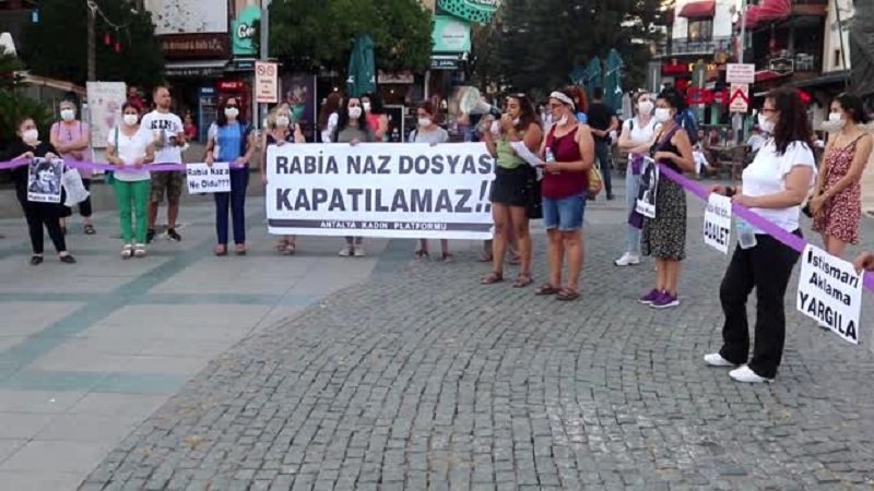 Antalya Kadın Platformu üyeleri, akşam saatlerinde Attalos Heykeli önünde toplandı. Yaklaşık 50 kadın ilk olarak Giresun’un Eynesil ilçesinde 2018 yılında hayatını kaybeden Rabia Naz Vatan’ın ölümüyle ilgili soruşturmada kovuşturmaya yer olmadığına dair karar verilmesine ilişkin basın açıklaması gerçekleştirdi.