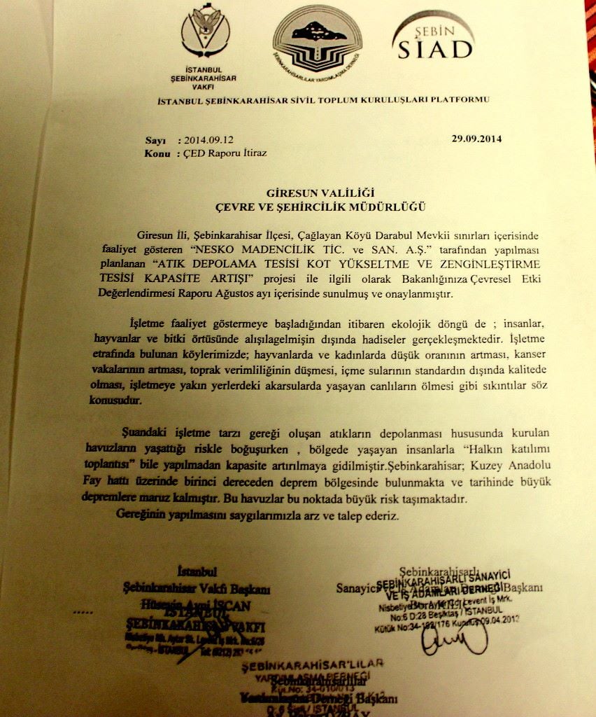 Şebinkarahisar Yardımlaşma Derneği, İstanbul sivil toplum kuruluşları platformu ve köy/mahalle Dernek Başkanları ile 2014 yılında yaptıkları Divan toplantısında Maden cevher atıklarının neden olacakları tehlikeyi gündeme getirmişlerdi ve ÇED raporlarına itiraz etmişlerdi