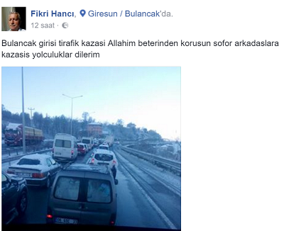 Giresun’da tanker ile TIR’ın çarpışması sonucu meydana gelen kazada hayatını kaybeden TIR şoförü Fikri Hancı’nın (55) kazadan önce sosyal paylaşım sitesi Facebook üzerinden yaptığı paylaşım yürek burktu. Fikri Hancı’nın kazadan 6 saat önce, “Bulancak girişi trafik kazası. Allah’ım beterinden korusun. Şoför arkadaşlara kazasız yolculuklar dilerim” paylaşımı yaptığı görüldü.